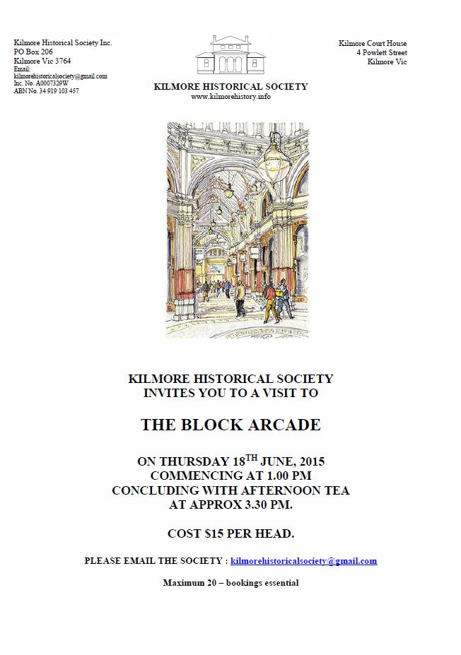 Kilmore Historical Society invites you to a a tour of the historic Block Arcade at 282 Collins Street, Melbourne for Thursday, 18 June at 1pm.