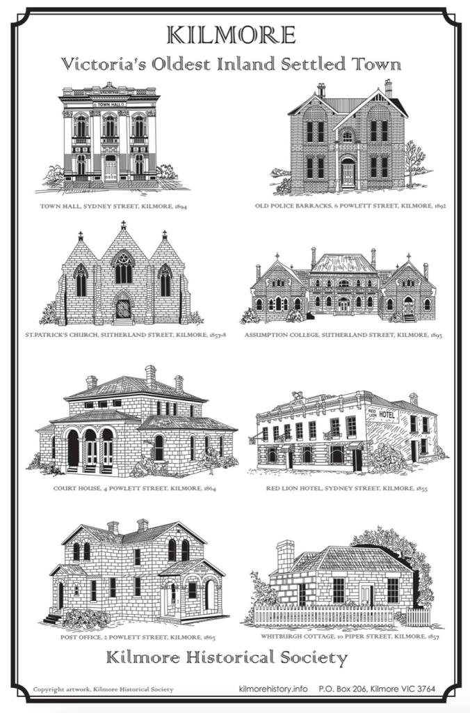 The Kilmore Historical Society has a new range of tea towels and shopping bags, decorated by sketches of historic local buildings. There are 10 different images available on the shopping bags. Eight of these are reproduced on tea towels. These are available at local fetes and markets and at KHS meetings. Why not buy one for a Christmas present ?