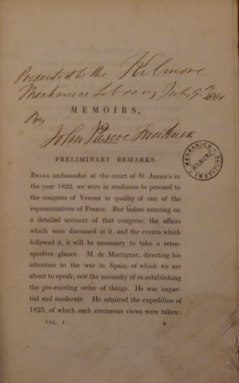 The Mechanics Institute had a library, as befitted its mission as an educational establishment. One item of note was that over 50 of its books had been donated by John Pascoe Fawkner. This library was disseminated in a sale after the demolition of the building, and few of these books can now be traced. Kilmore Historical Society has been able to locate one, with JPF’s signature.