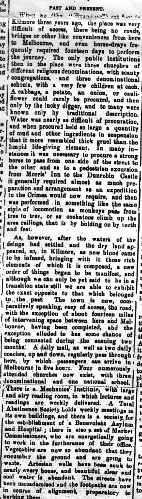 “When we at the Examiner set foot in Kilmore three years ago, the place was very difficult of access, there being no roads, bridges, or other like conveniences from here to Melbourne, and even horse-drays frequently required fourteen days to perform the journey. The only public institutions then in the place were three churches of different religious denominations, with scanty congregations, and three denominational schools, with a very few children at each. A cabbage, a potato, an onion or cauliflower could rarely be procured, and then only by the lucky digger, and to many were known only by traditional description.
